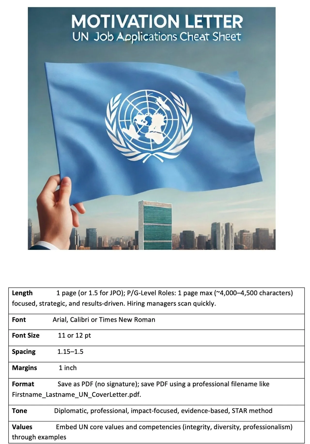 When applying to the United Nations, your motivation letter (often called a cover letter) plays a critical role. It is your chance to demonstrate alignment with the UN’s mandate, showcase relevant experience, and reflect the values expected of international civil servants. However, the expectations for formatting and tone differ subtly across internship, JPO, and professional (P/G-level) roles.